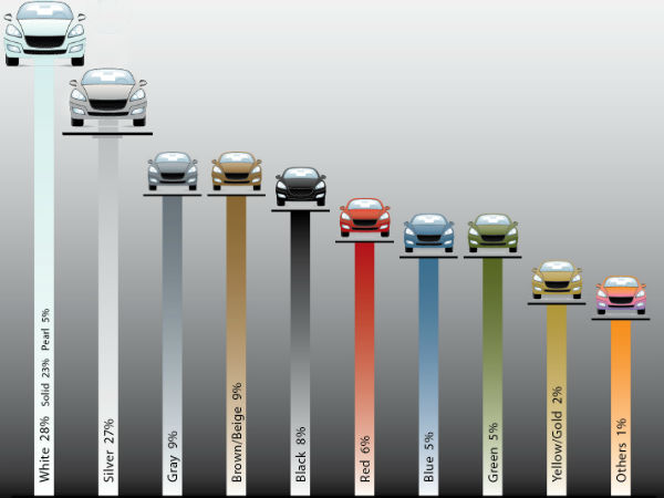 देश की सड़कों पर सबसे ज्यादा सफेद रंग की कारों की संख्या है। इस संस्था ने देश में कारों को रंगों के आधार पर सर्वेक्षण कर एक चार्ट भी जारी किया है। जिसमें यह दर्शाया गया है कि देश में सबसे ज्यादा 28 प्रतिशत सफेद कारें हैं। सफेद कारों में भी दो रंग विध्यमान है, जिसमें 23 प्रतिशत शॉलिड व्हाईट और 5 प्रतिशत पर्ल व्हाईट शामिल हैं। इसके अलावा दूसरे स्थान पर सफेद के बाद सिल्वर कारों का नंबर आता है जो कि लगभग 27 प्रतिशत तक भारतीय सड़क पर अपना कब्जा जमाये हुए हैं।