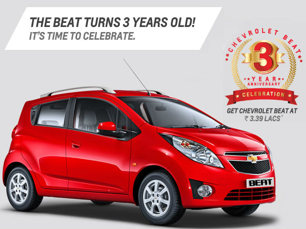 भारतीय बाजार में एक से बढ़कर एक शानदार कारों को पेश करने वाली अमेरिका की प्रमुख कार निर्माता कंपनी जनरल मोटर्स अपने सब ब्रांड शेवरले की बेहतरीन हैचबैक कार शेवरले बीट पर भारी छूट की घोषणा की है। आपको बता दें कि भारतीय बाजार में शेवरले बीट को लॉन्च हुये कुल 3 साल हो गयें, और कंपनी इस समय बीट की बेहतरीन सफलता पर उसका तीसरा वर्षगांठ मना रही है।
