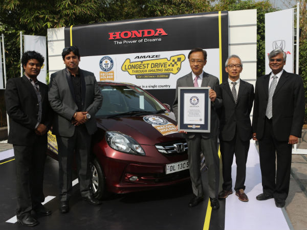 अब यह बात सुनिश्चित हो चुकी है कि होंडा कार्स इंडिया का नाम गिनीज वर्ल्ड रिकॉर्ड में दर्ज हो चुका है। उन्होंने किसी एक देश में कार द्वारा सबसे लंबी यात्रा का रिकॉर्ड दर्ज किया है। होंडा का फैमली सेडान अमेज ने संपूर्ण भारत में 400 शहरों का भ्रमण करते हुए लगभग 23,800 किलोमीटर की दूरी तय की।