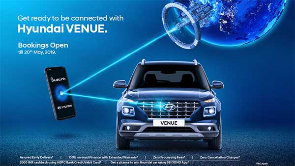 हुंडई वेन्यू की बुकिंग 20 मई तक चलेगी और 21 मई को इसे बाजार में बिक्री के लिए उतारा जाएगा। कंपनी इसके साथ ही इस कॉम्पैक्ट एसयूवी की बुकिंग में कई तरह के ऑफर दे रही है तथा कंपनी ने दावा किया है कि ग्राहकों को जल्द से जल्द ही इसकी डिलीवरी हो जायेगी।