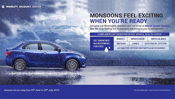 मारुति सुजुकी मानसून सर्विस कैंप लेकर आयी है जिसके तहत ग्राहक देश भर के किसी भी मारुति डीलरशिप में अपनी कार की फ्री चेकअप करा सकते है। यह 20 जून से 20 जुलाई तक चलने वाली है। कंपनी पिछले साल भी इसी तरह का कैंप लेकर आयी थी।