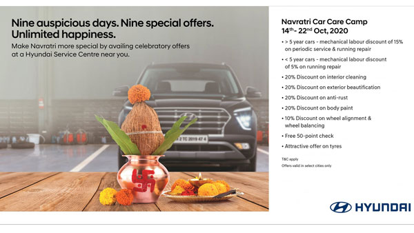 हुंडई ने नवरात्री के अवसर पर 14 से 22 अक्टूबर तक नवरात्री कार केयर कैंप शुरू करने की घोषणा की है। इस कार केयर कैंप में हुंडई के ग्राहकों को कार के इंटीरियर-एक्सटीरियर क्लीनिंग के साथ नई पेंट और सर्विसिंग पर डिस्काउंट व ऑफर दिए जाएंगे। कंपनी अपनी कारों के कई मॉडलों की सर्विसिंग पर यह डिस्काउंट दे रही है।