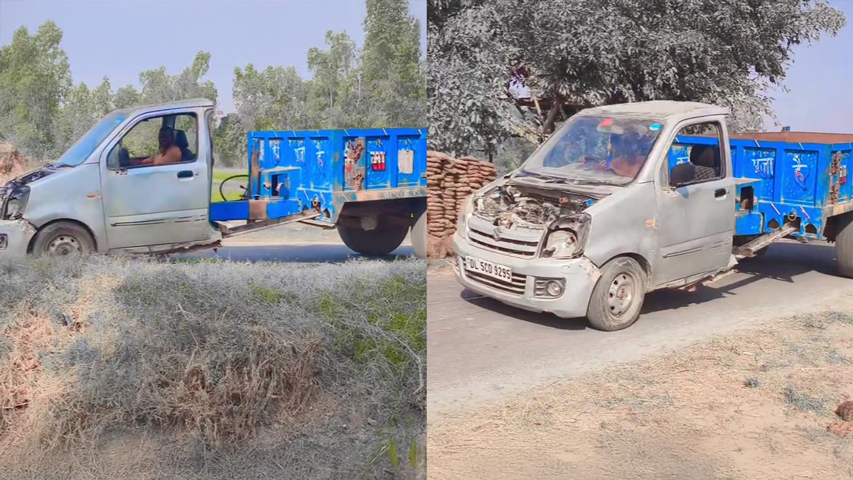 दरअसल, एक शख्स ने पुरानी Maruti Suzuki WagonR खरीदी और इसे अपने इस्तेमाल के लिए ट्रैक्टर में बदल दिया। वीडियो में देख सकते हैं कि वैगनआर के पीछे के आधे हिस्से को पूरी तरह से हटा दिया गया है और उसकी जगह ट्रैक्टर के लोड-कैरी ट्रेलर को जोड़ा गया है। यह आधी वैगनआर कार और आधी ट्रैक्टर जैसी दिखती है।
