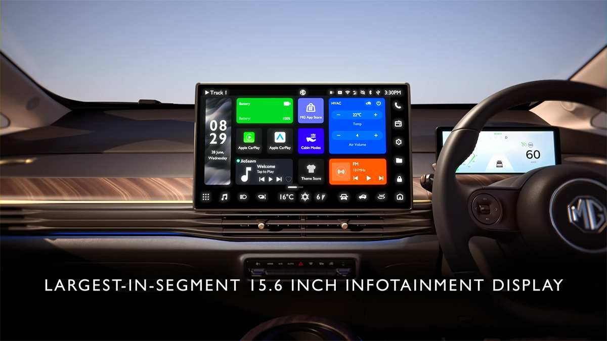 MG Windsor EV इंटीरियर: नई एमजी विंडसर इलेक्ट्रिक में सेगमेंट-लीडिंग 15.6-इंच टचस्क्रीन इंफोटेनमेंट सिस्टम मिलता है। इसे ग्रैंडव्यू डिस्प्ले (Grandview display) कहा जाता है। यह सेगमेंट में पेश किया गया सबसे बड़ा डिस्प्ले होने के साथ ही यह भारत में बेची जाने वाली किसी भी मौजूदा एमजी कार में सबसे बड़ा है।