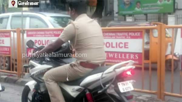 यह घटना चेन्नई की है, जहां एक नागरिक ने ट्विटर पर सब इंस्पेक्टर टी एस माधन कुमार की तस्वीर अपलोड कर दिया है। पुलिसकर्मी को बिना हेलमेट के मोटरसाइकल पर सवार देखा जा सकता था।