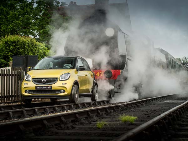 स्मार्ट कार दुनिया भर में अपने छोटे आकार और तेज गति के लिये मशहूर है। इस कार को ट्रेन के पटरियों पर दौड़ाने के लिये खासा इंतजाम किया गया है।