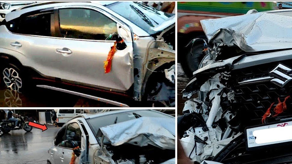 क्षतिग्रस्त हुई कार: तेज रफ्तार के कारण कार को गंभीर नुकसान पहुंचा है। तस्वीरों में आप देख सकते हैं कि Fronx कार का अगला दाहिना हिस्सा किस तरह डैमेज हो गया है। इसके अलावा कार के फ्रंट बंपर, ग्रिल, बोनट, फेंडर, हेडलैंप और टायर को भारी नुकसान पहुंचा है।