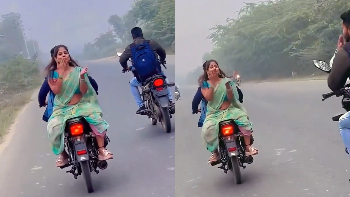 सोशल मीडिया पर वायरल हो रहे इस वीडियो में आप देख सकते हैं कि एक महिला Hero Splendor बाइक पर उल्टी बैठी हुई है। बाइक पर बैठी हुई महिला वीडियो में अपने पीछे चले आ रहे एक और Bajaj Platina बाइक सवार को फ्लाइंग किस देती हुई दिखाई दे रही है।