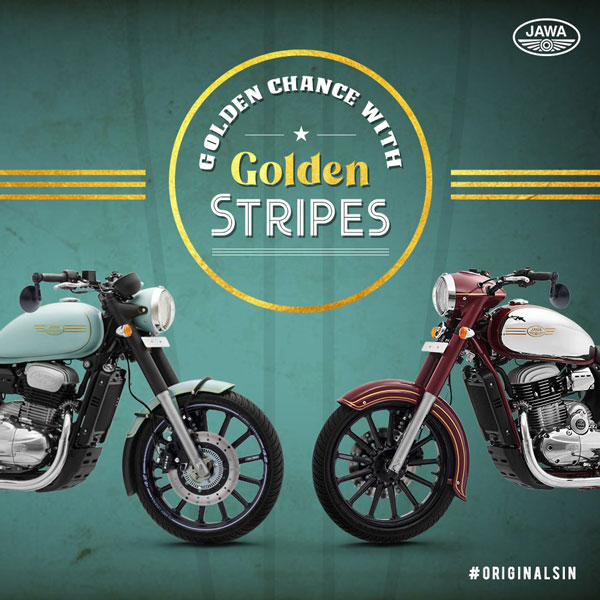 बार-एंड मिरर बाइक के ओवर ऑल लुक को बेहतर बनाते हैं, जबकि अलॉय व्हील्स के साथ ट्यूबलेस टायर्स का इस्तेमाल काफी सुविधा प्रदान करता है। गोल्डेन स्कीम के बारे में ज्यादा जानने के लिए आप अपने नजदीकी जावा डीलरशिप से सम्पर्क कर सकते हैं।